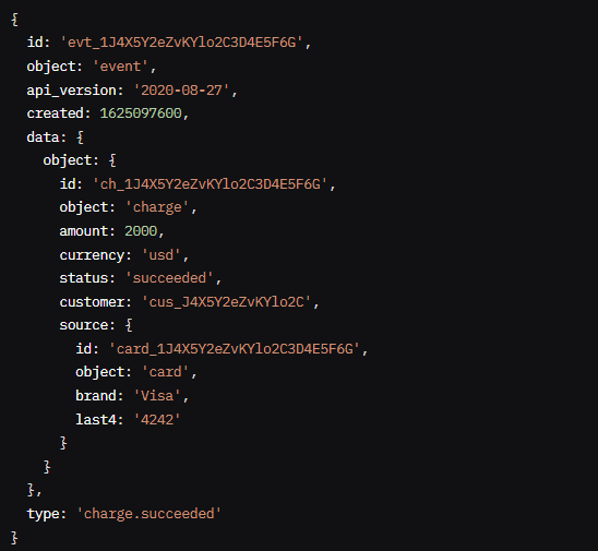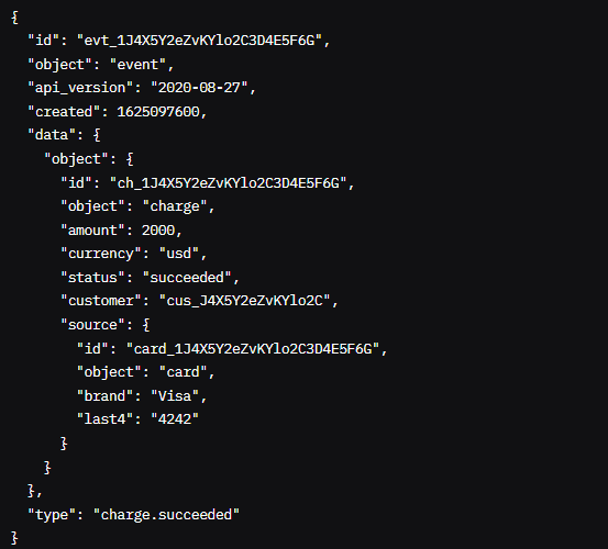 When using an SDK like Stripe’s Node.js library, the webhook event is parsed into a structured object. Here’s a sample response for a charge.succeeded event: