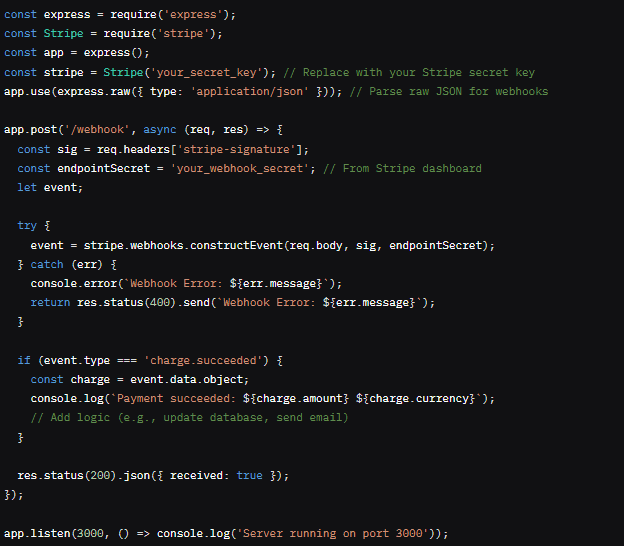 const endpointSecret = 'your_webhook_secret'; // From Stripe dashboard